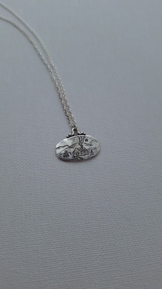 Hand Carved Sterling Silver Mountain Cabin Necklace – One of a Kind Landscape Pendant