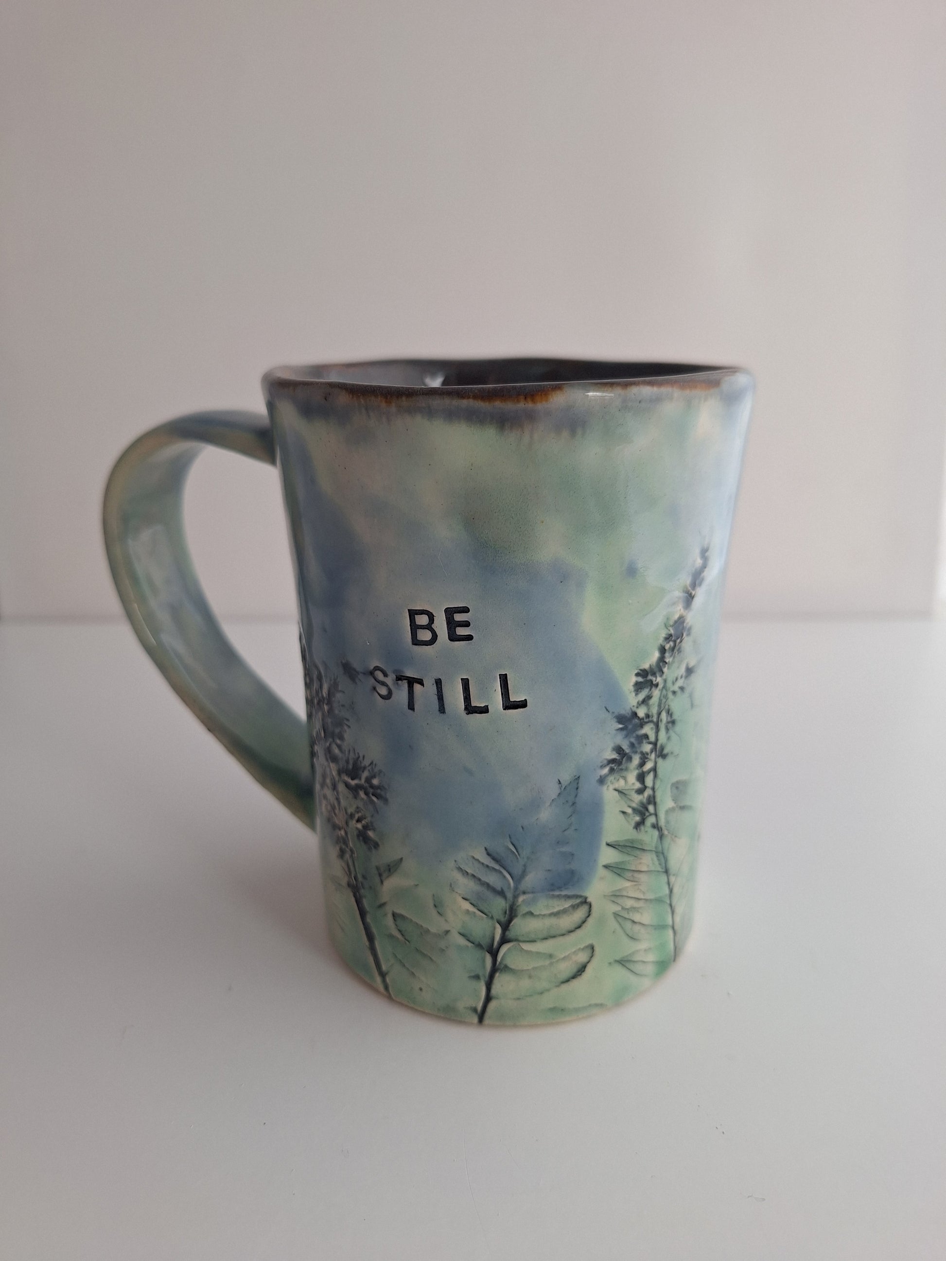 This mug is a handcrafted piece of art that features leaves pressed into its design. Enjoy your morning coffee in a one-of-a-kind mug.