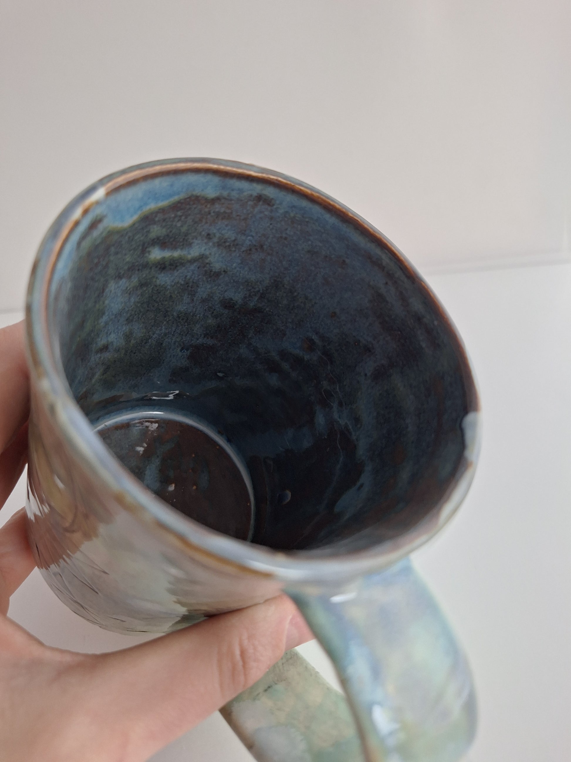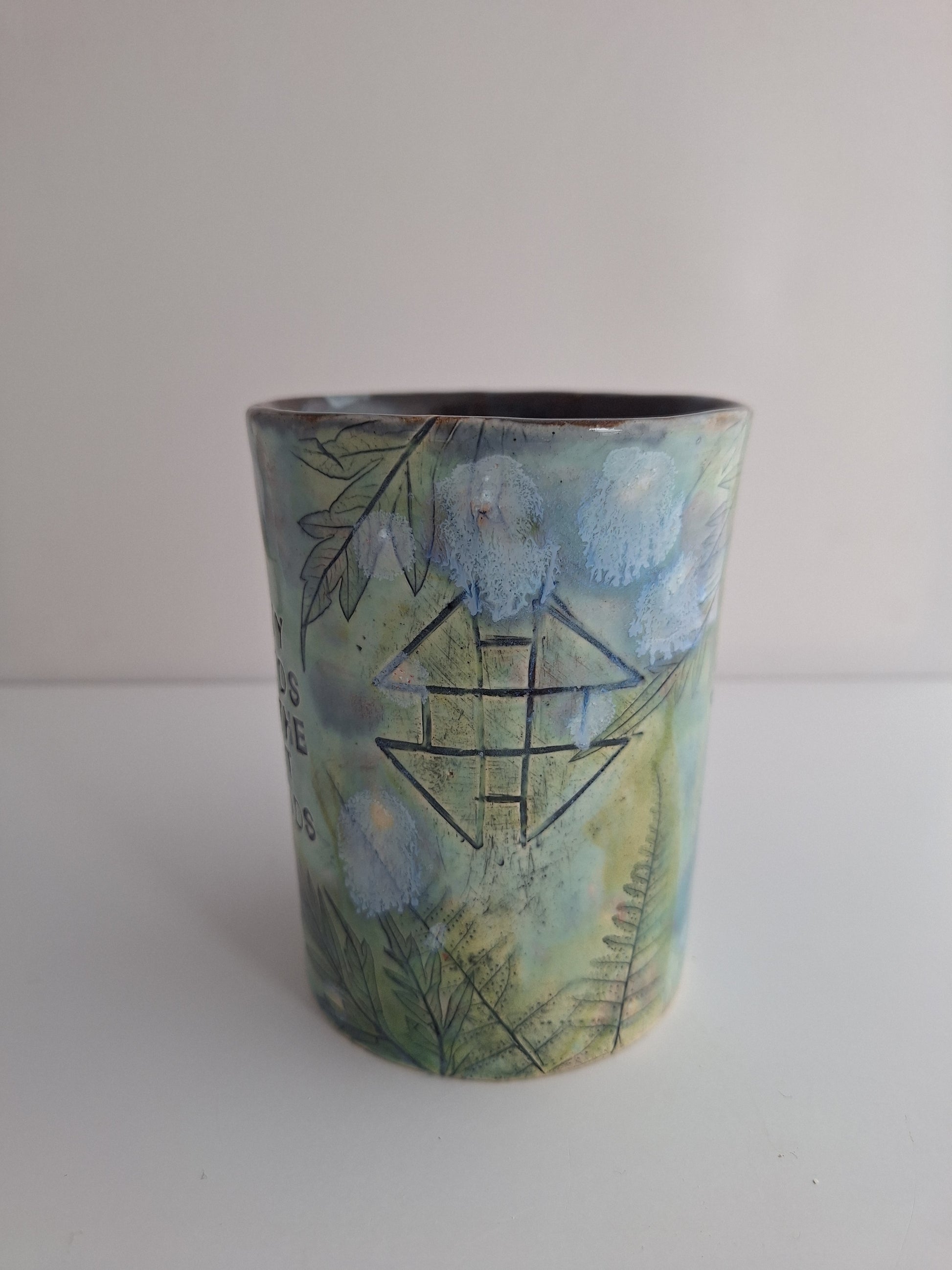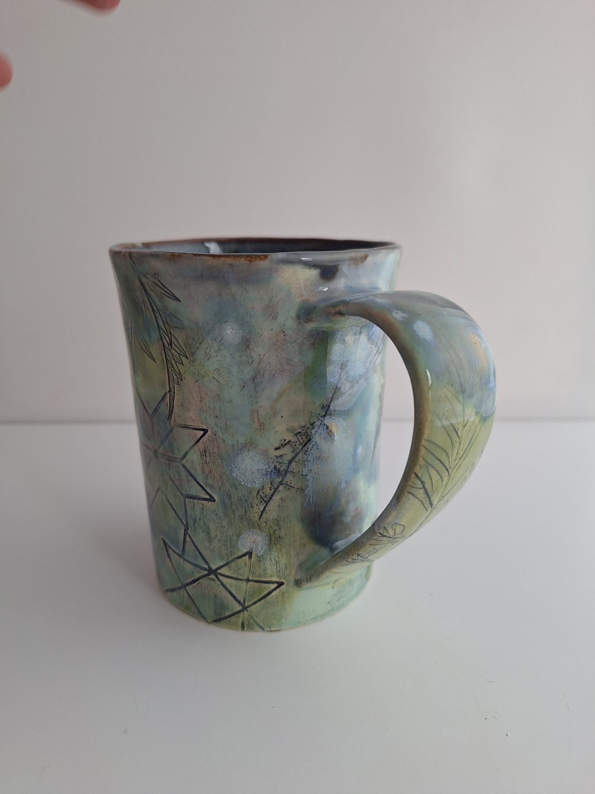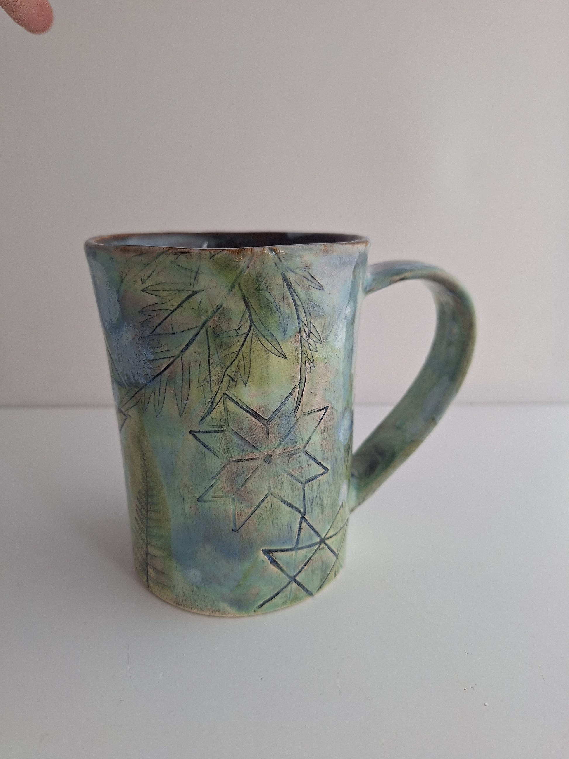 This mug is a handcrafted piece of art that features leaves pressed into its design. Enjoy your morning coffee in a one-of-a-kind mug.