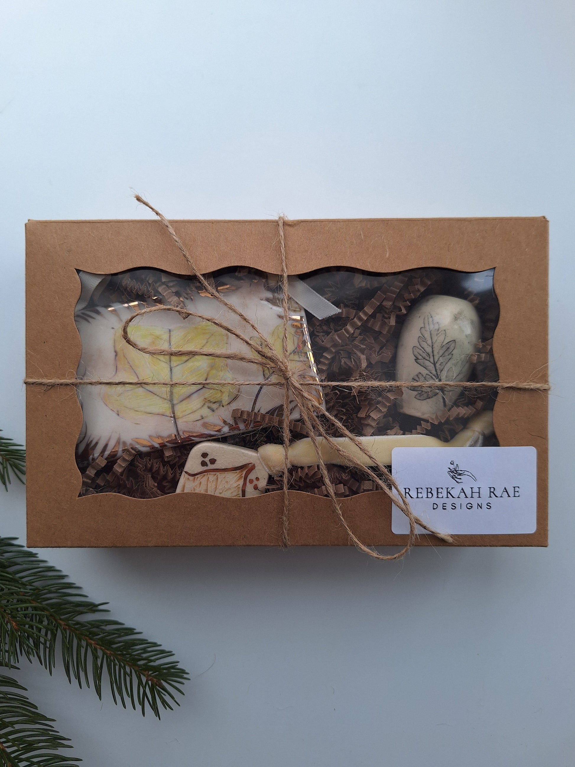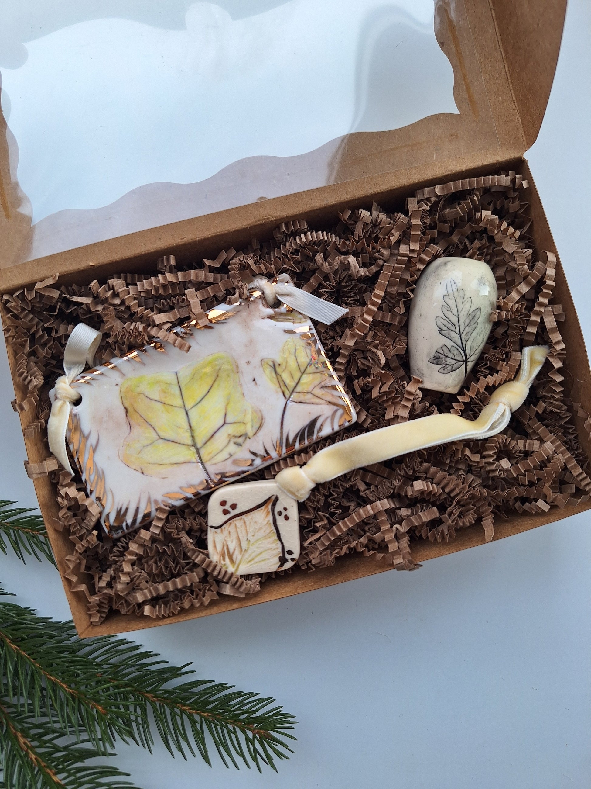This gift set includes two ornaments and a tiny vase, individually handcrafted and curated. Boxed and ready to gift.