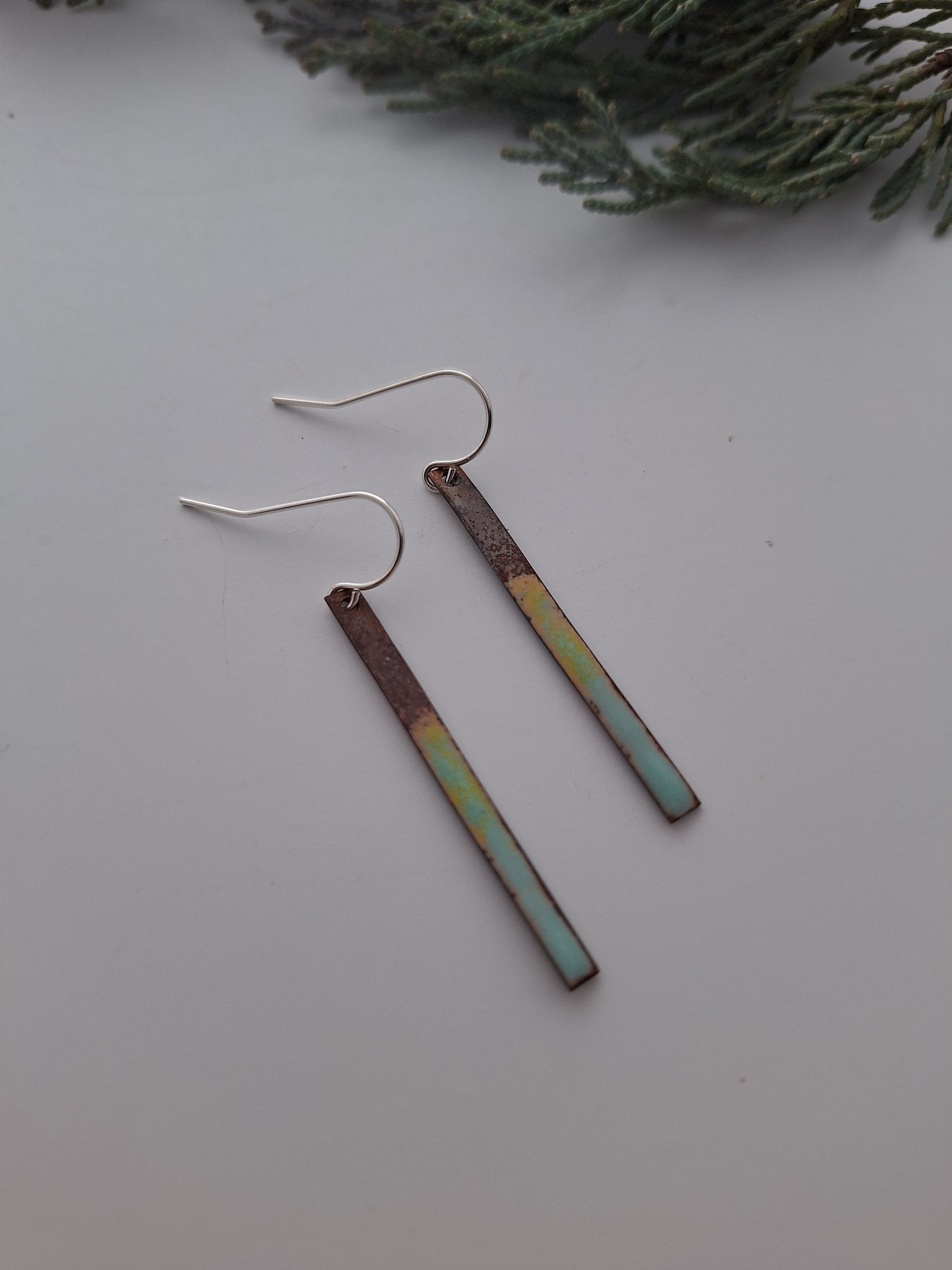 These earrings are a must-have accessory. One of a kind patinaed copper and sterling earwires.