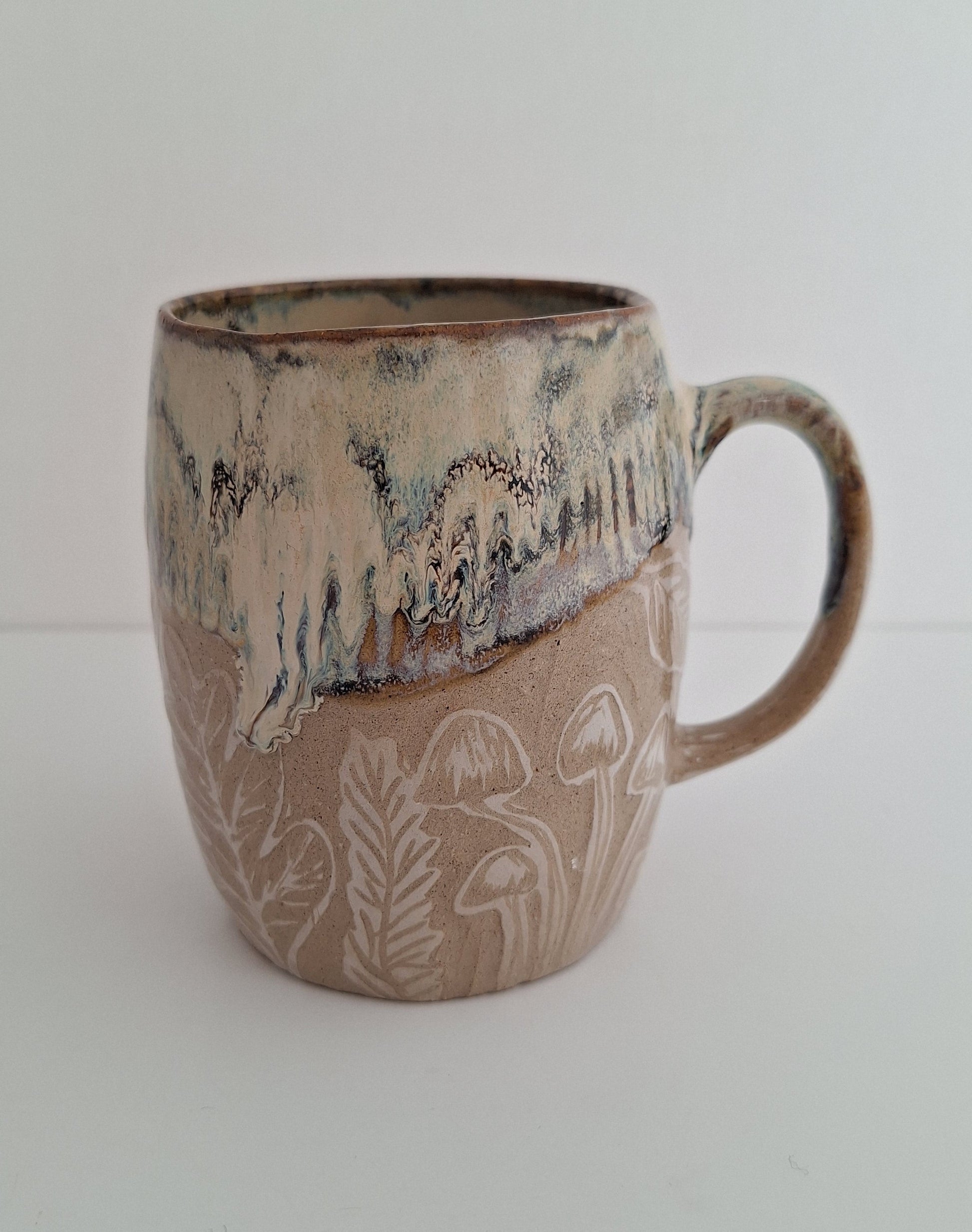 Each mug is created by hand in my little Pennsylvania home studio. The design is carved directly into the clay surface, revealing the natural clay beneath layered glaze and creating detailed texture and depth throughout the piece.