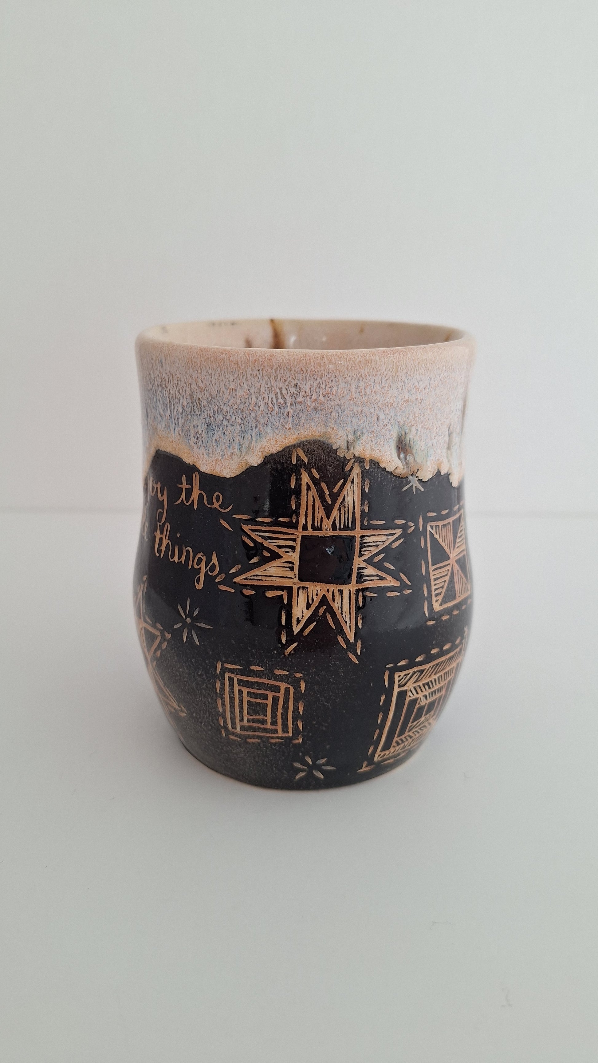 *Second* Hand Carved Stoneware Mug – Simple Things, Quilt blocks - One of a Kind Sgraffito Mug