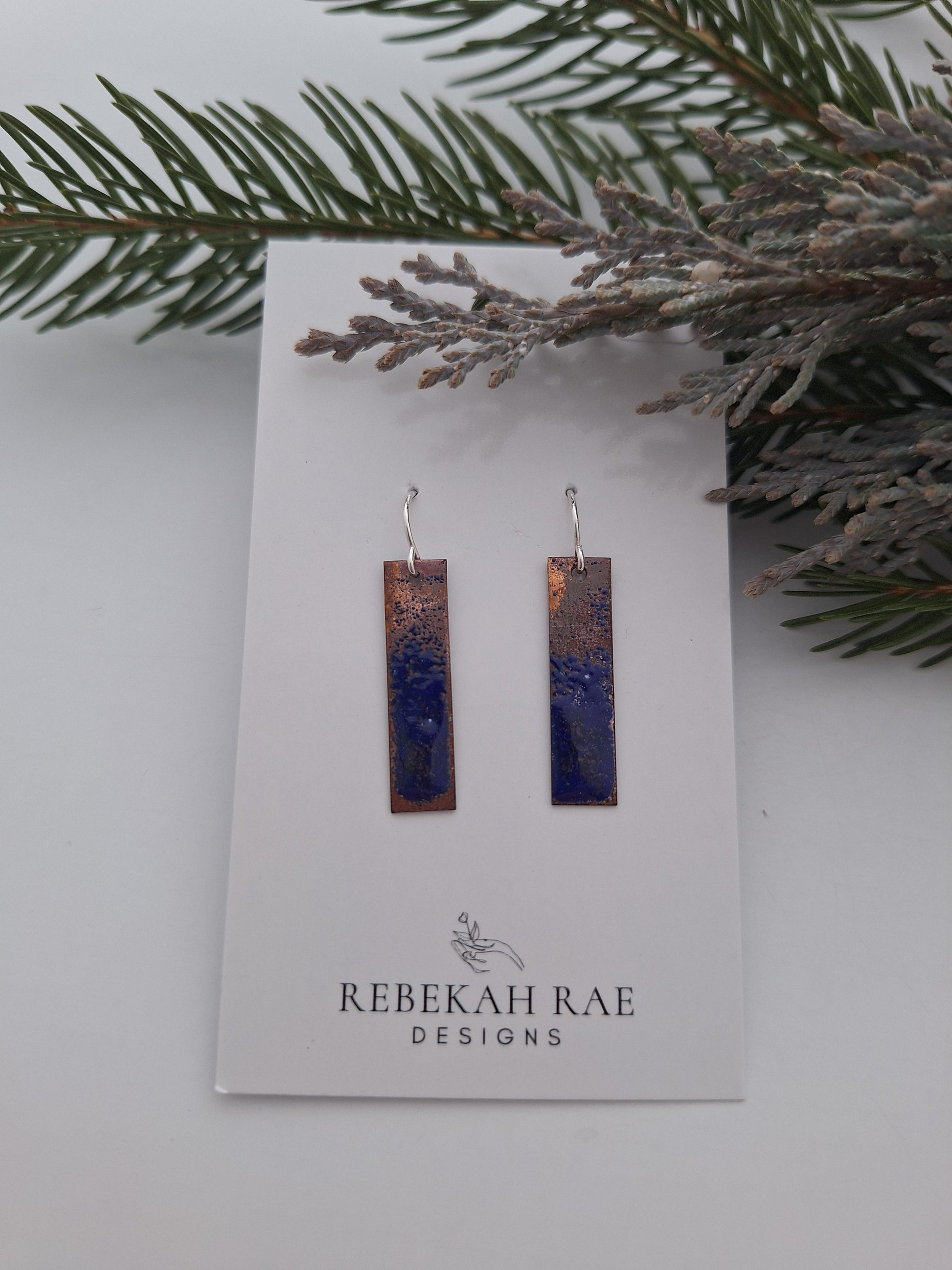 These earrings are handcrafted with a mix of copper and blue enamel for an earthy, nature-inspired color combination.