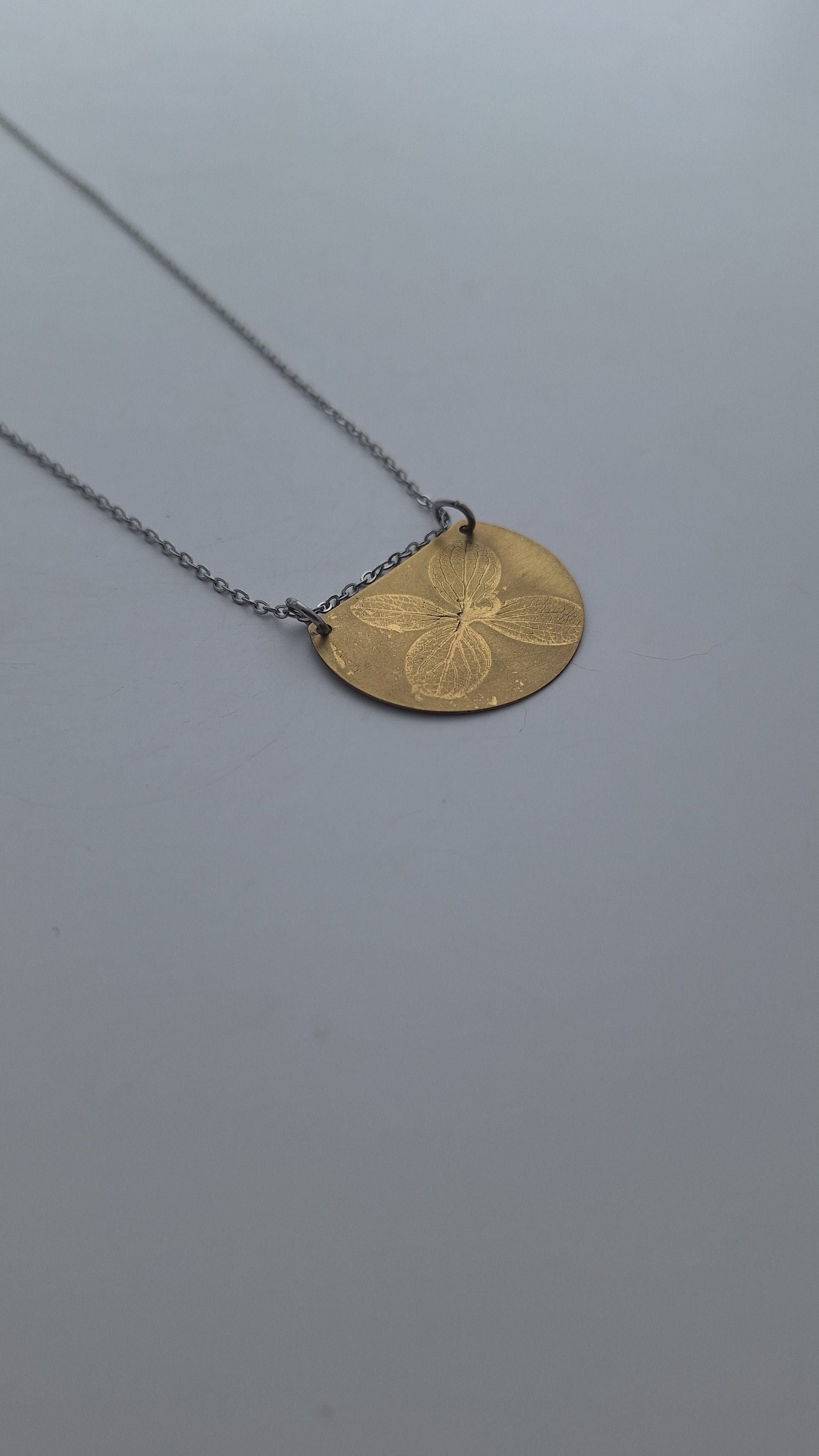 This necklace begins with a real hydrangea bloom pressed directly into brass, leaving behind the delicate veins and quiet texture of the flower. No two impressions are ever the same, making each piece completely one of a kind.