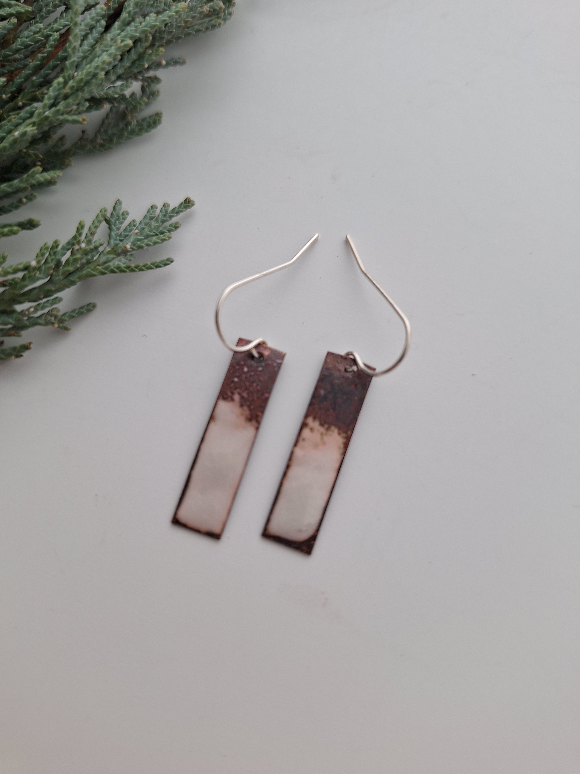 These earrings are a must-have accessory. One of a kind patinaed copper with sterling accents and sterling earwires.