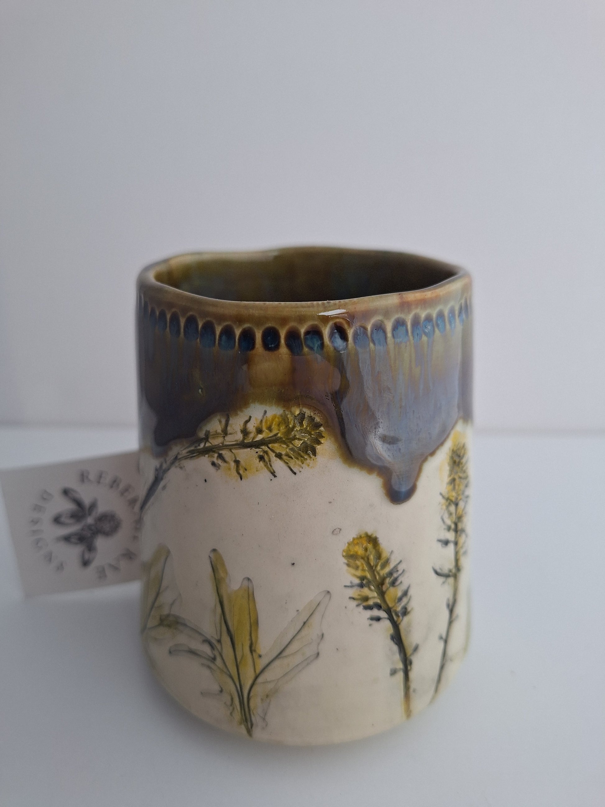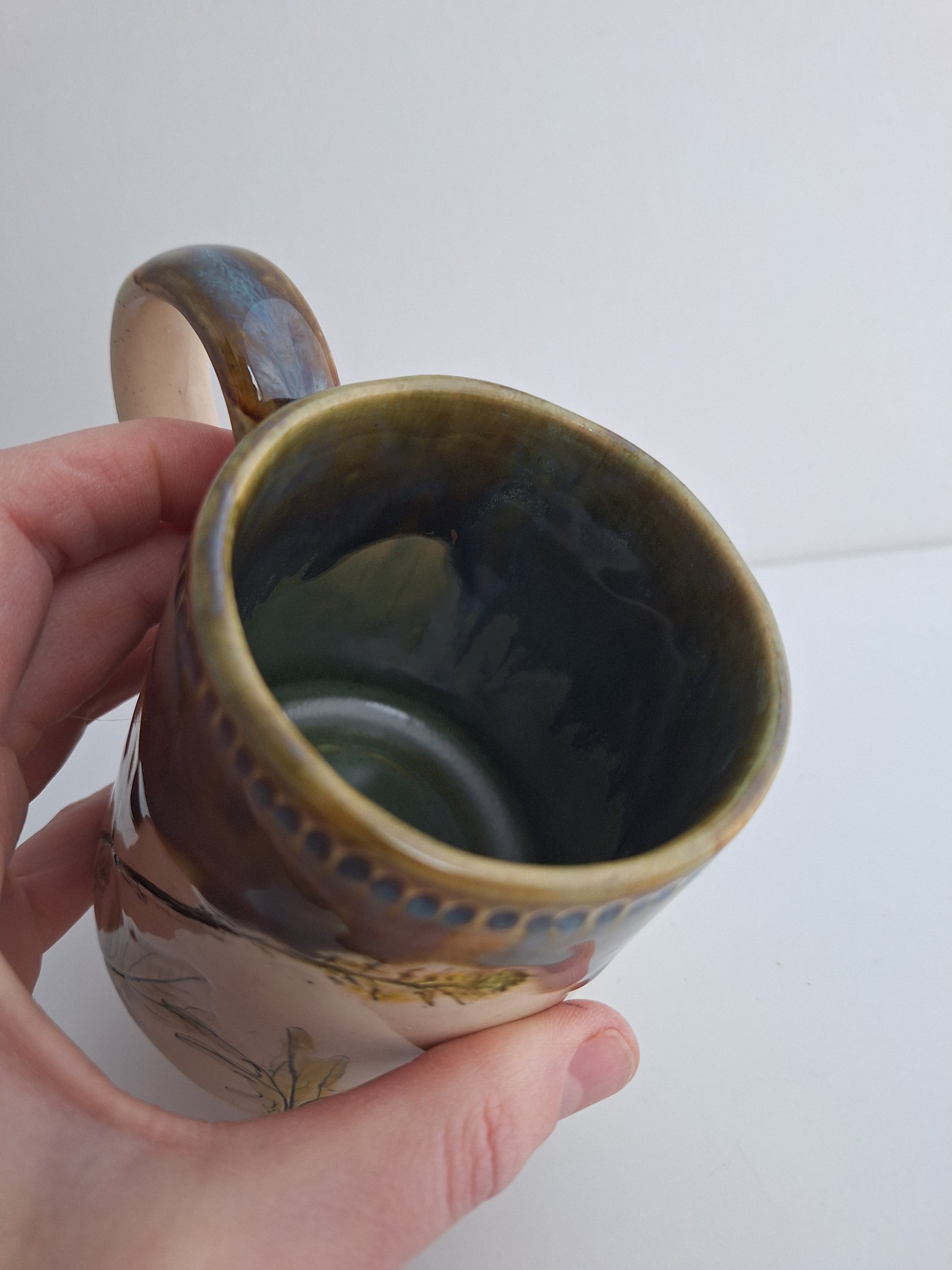 This mug is a handcrafted piece of art that features pressed leaf accents. Enjoy your morning coffee in a one-of-a-kind mug.