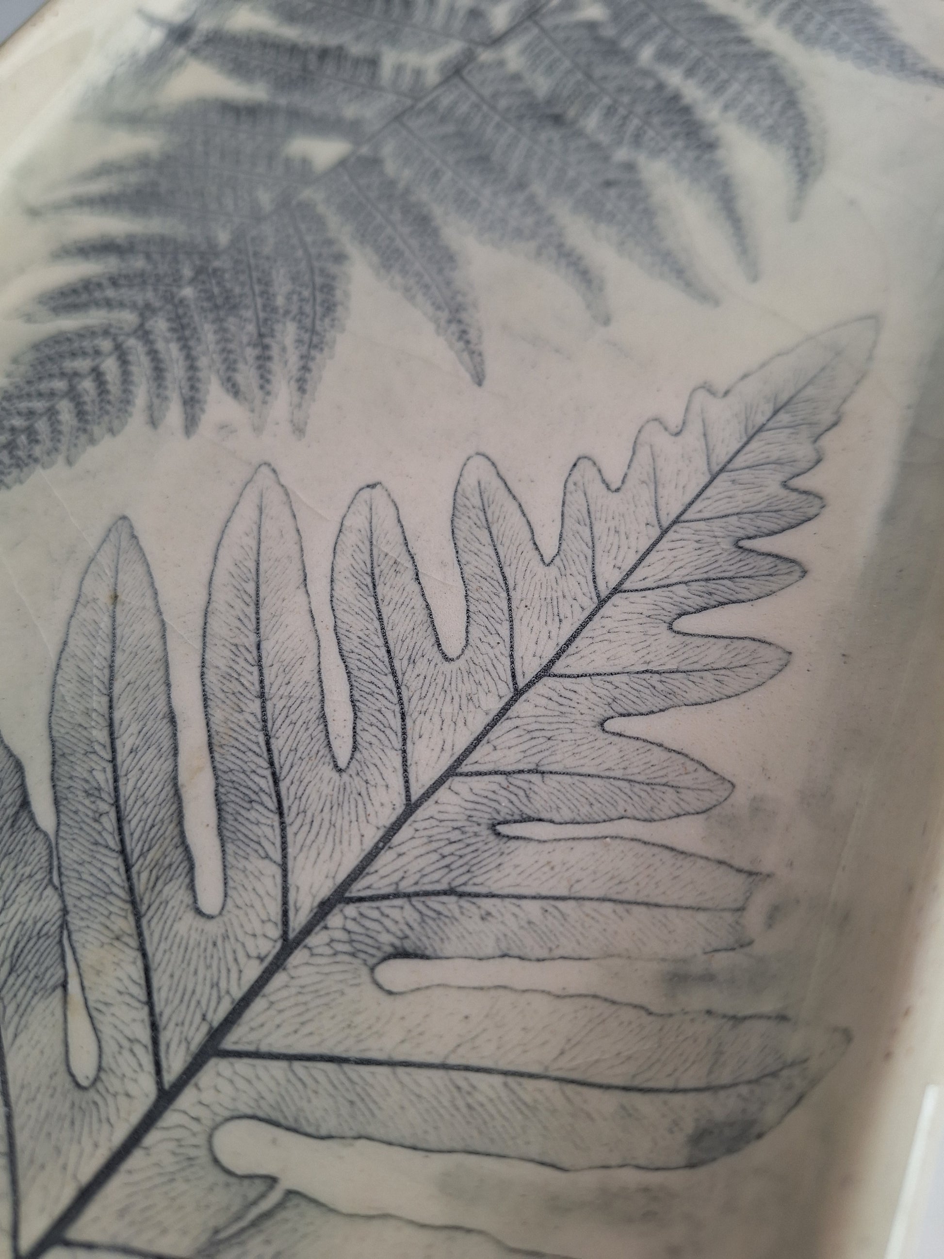 This Fern Plate features unique, hand-pressed wild ferns on organic-shaped ceramic stoneware. It is one of a kind, blending natural beauty with functional craftsmanship. Perfect for adding a touch of nature to your table, or for storing accessories. See photo for size reference.
