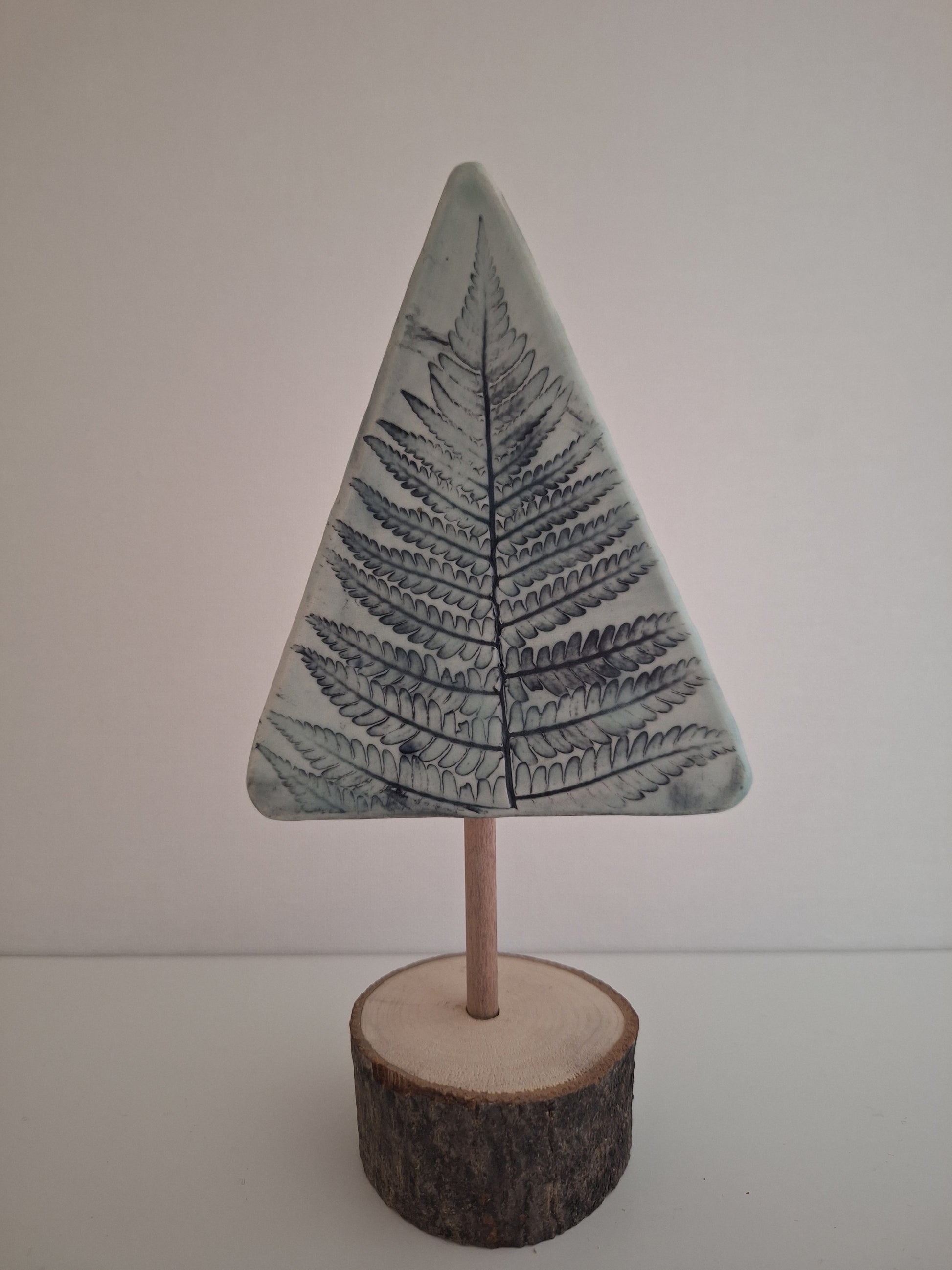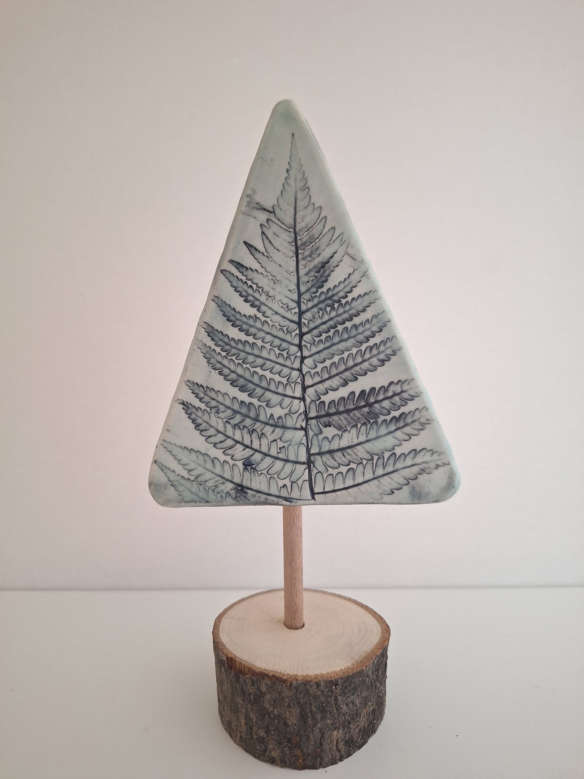 7.5" in height - Unique and natural, this Fern Tree is handcrafted from pressed wild ferns in stoneware clay. Each piece is one of a kind, set on a hand-cut PA wood slab. Bring a touch of the great outdoors into your home with this creation.