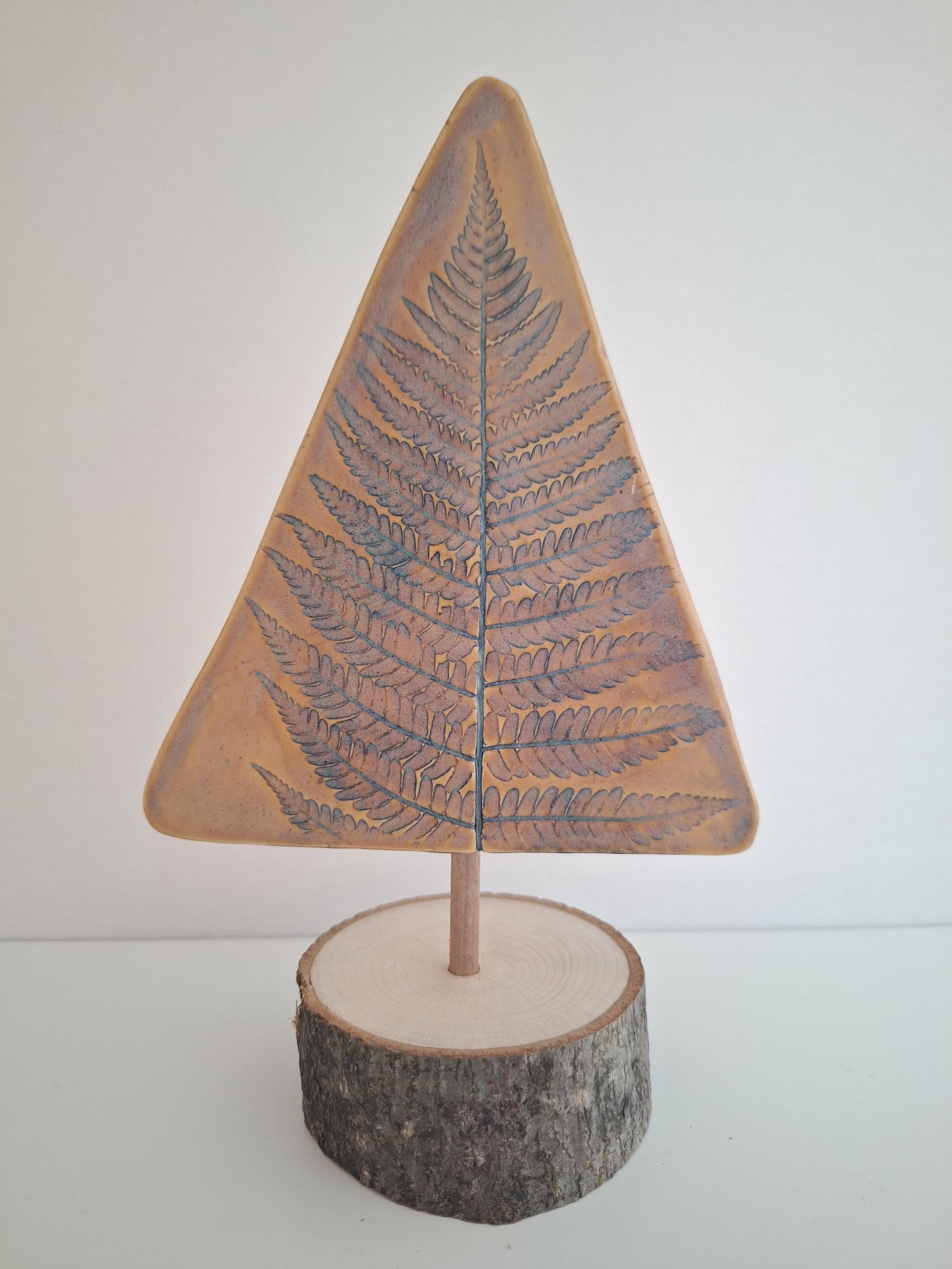8.5" in height - Unique and natural, this Fern Tree is handcrafted from pressed wild ferns in stoneware clay. Each piece is one of a kind, set on a hand-cut PA wood slab. Bring a touch of the great outdoors into your home with this creation.