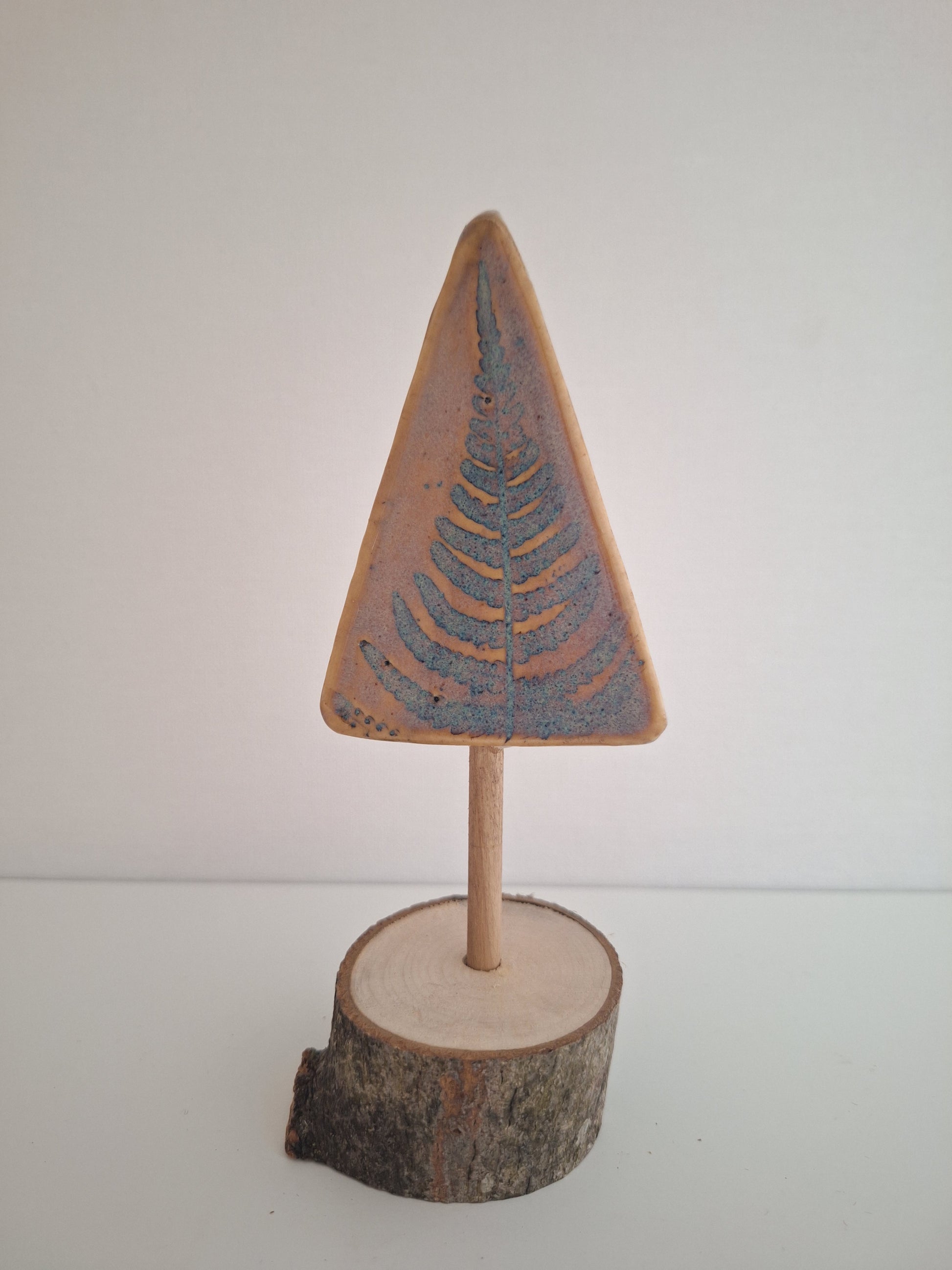 6.5" in height - Unique and natural, this Fern Tree is handcrafted from pressed wild ferns in stoneware clay. Each piece is one of a kind, set on a hand-cut PA wood slab. Bring a touch of the great outdoors into your home with this creation.