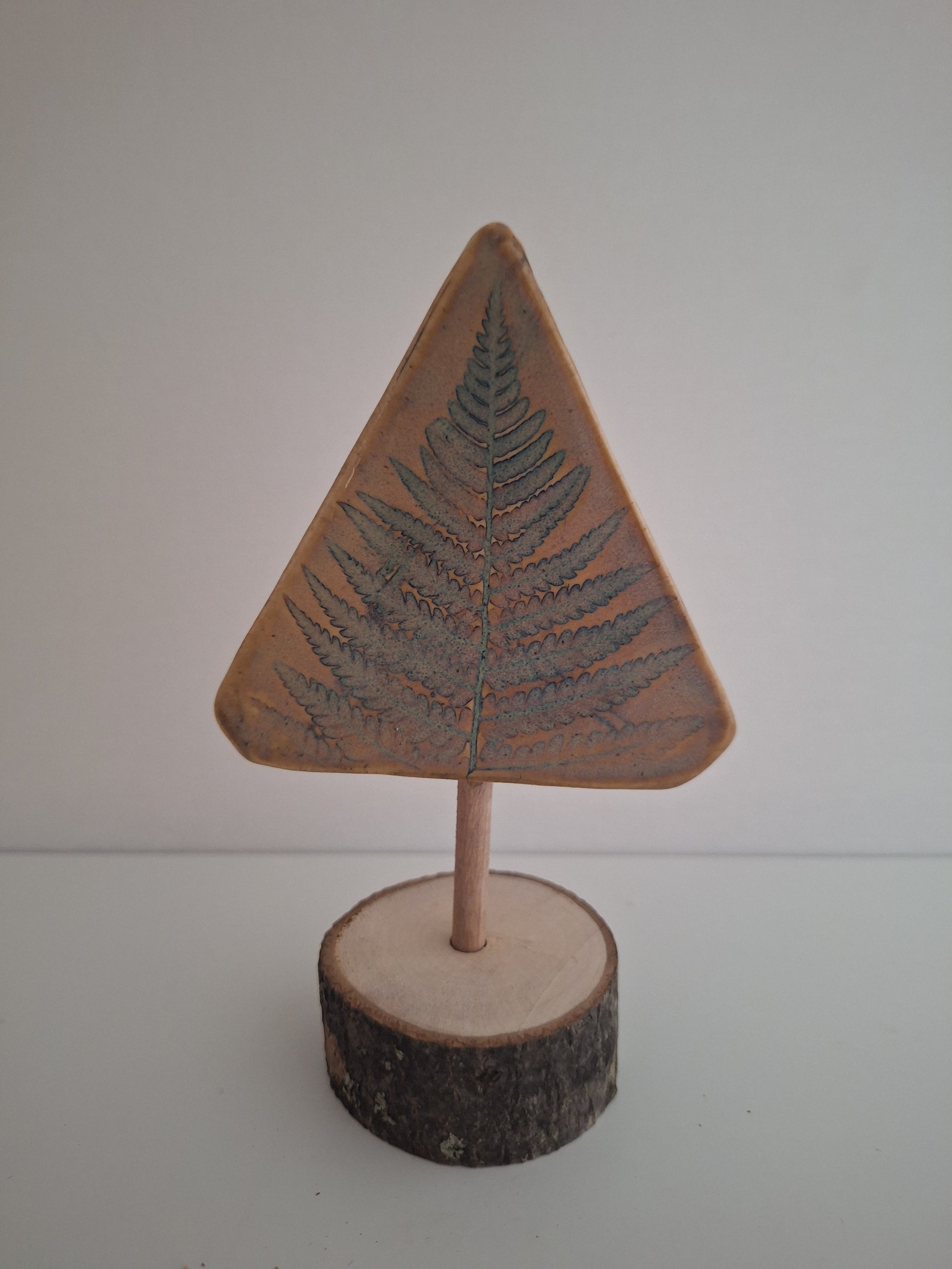 6" in height - Unique and natural, this Fern Tree is handcrafted from pressed wild ferns in stoneware clay. Each piece is one of a kind, set on a hand-cut PA wood slab. Bring a touch of the great outdoors into your home with this creation.