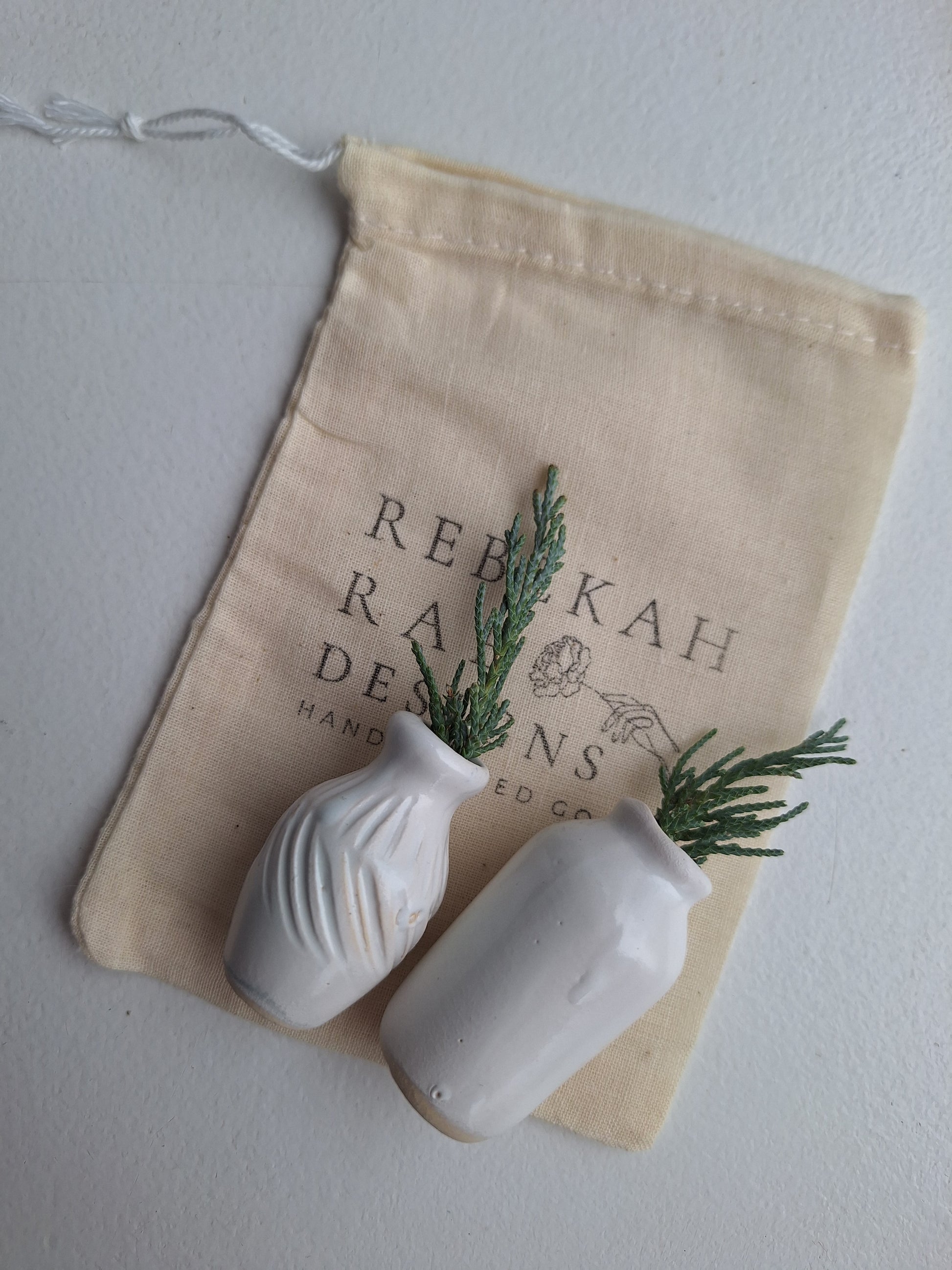 This set of two tiny vases, also known as "mommy pots", is the perfect gift for any parent. These vases are ideal for those short stem flowers that little ones tend to bring in. Comes in a cute cotton drawstring bag, ready to gift.